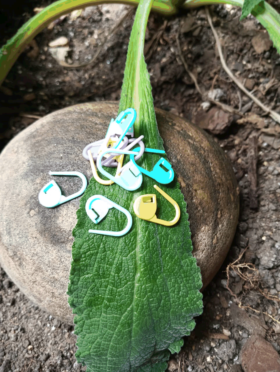 Plastic colourful safety pin style stitch markers.